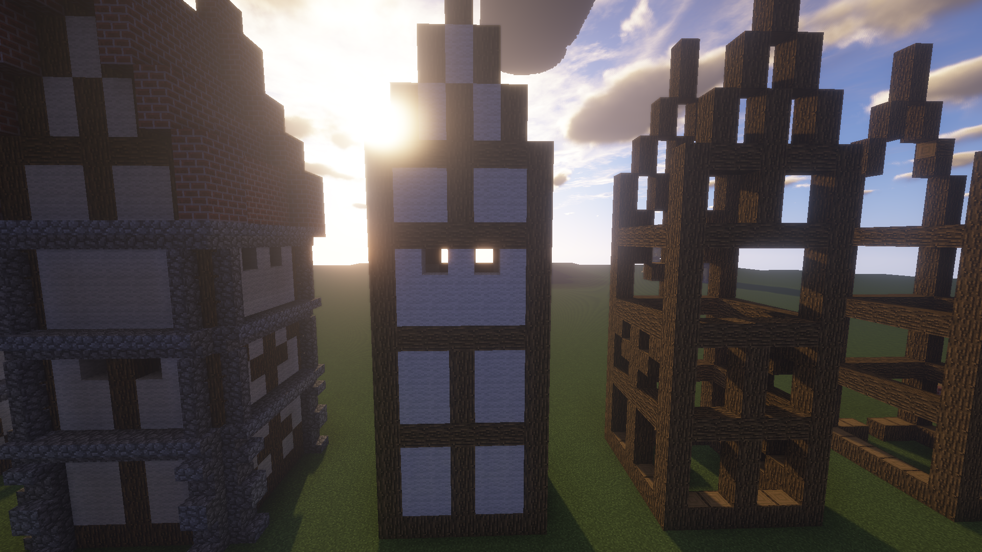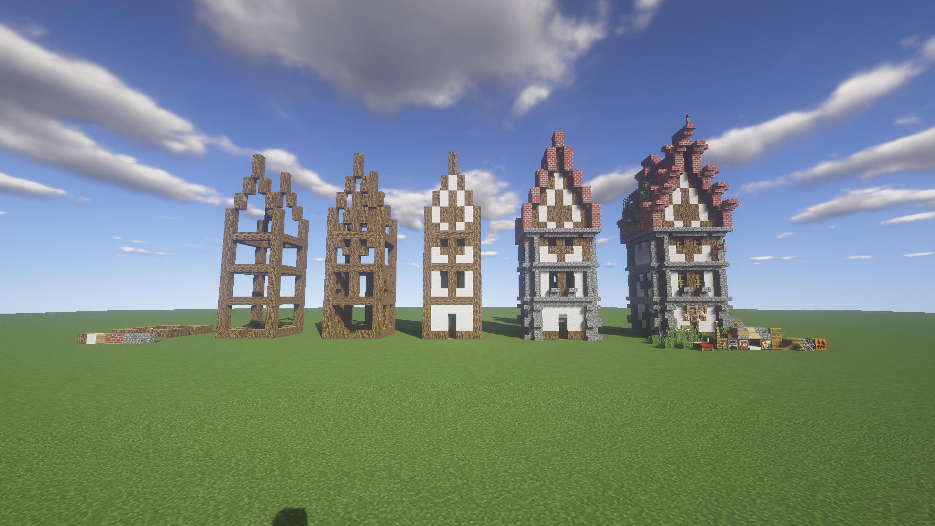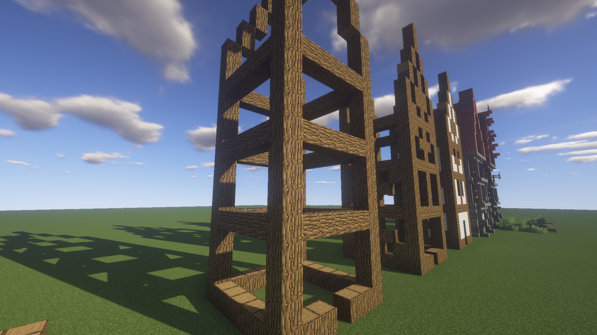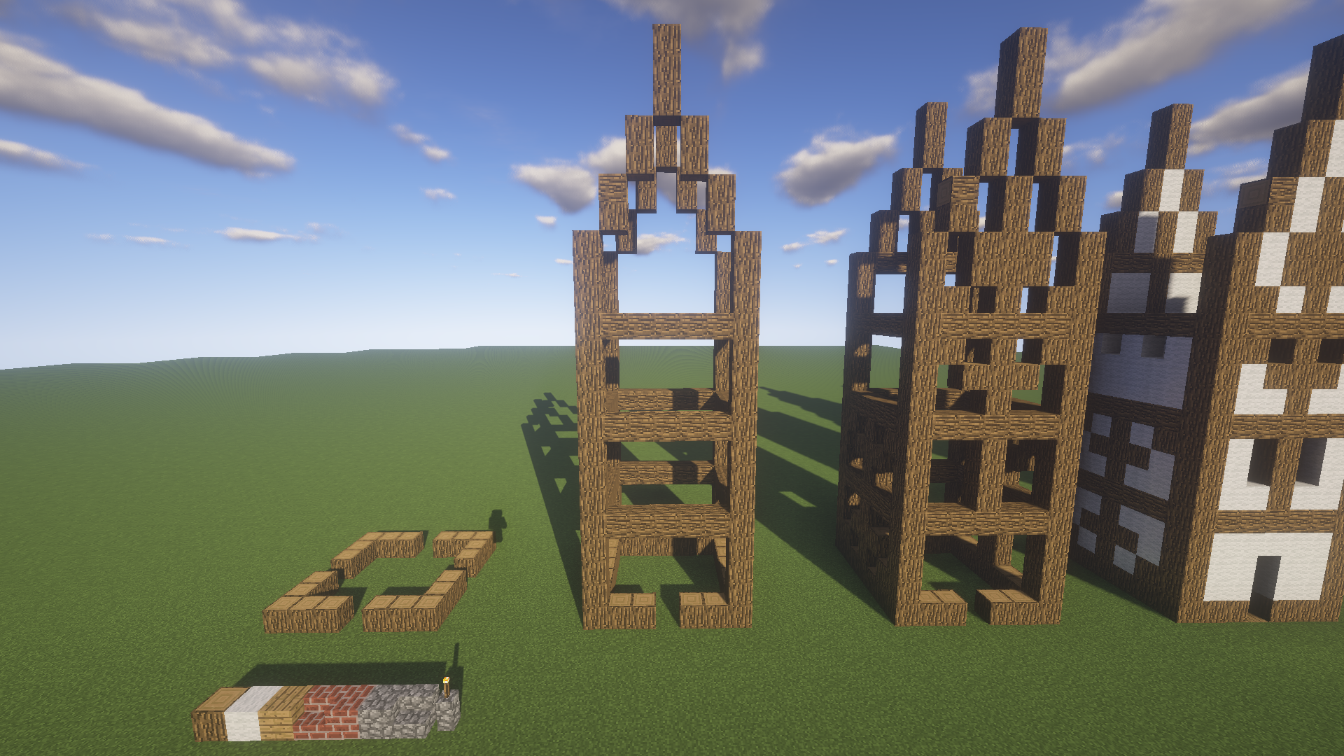 第二步:外框架搭建用橡木搭建一个外框,这个外框就类似于骨架,确定了建筑的基本形态,由于是中世纪风格,所以屋顶采用尖顶