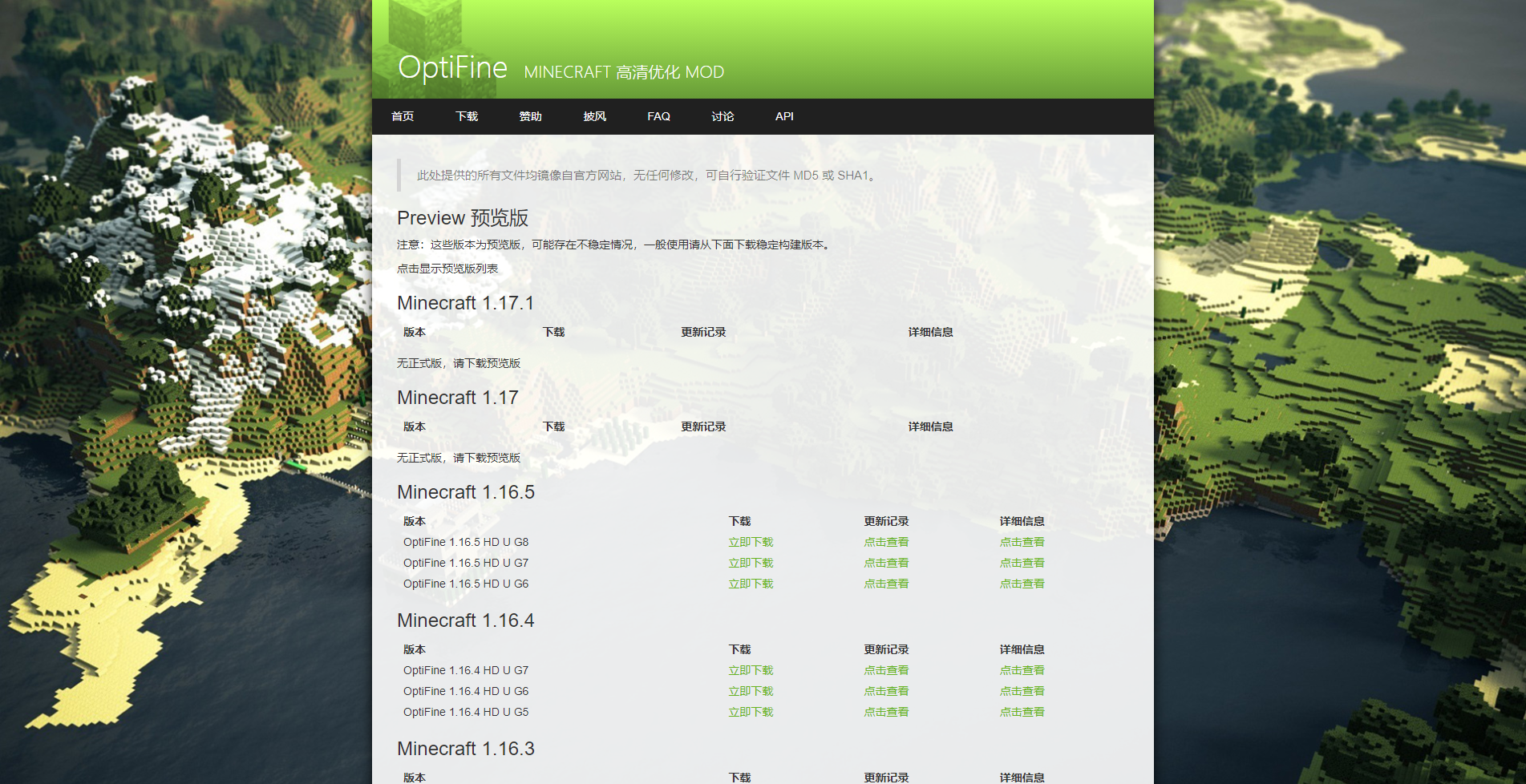 - 所有的文件与官方同步更新,当 OptiFine 官方发布新版本时镜像站也会同步。