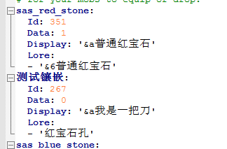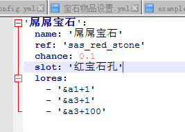 '精良红宝石':name: '精良红宝石'# 引用Mythicmob的items的物品idref: 'sas_red_stone_2'chance: 0.5# 孔位idslot: '红宝石孔'lores: - '&a力量+10' - '&a血量+10''普通蓝宝石':name: '普通蓝宝石'# 引用Mythicmob的items的物品idref: 'sas_blue_stone'chance: 0.5# 孔位idslot: '蓝宝石孔'lores: - '&a速度+2'- '&a攻速+2''精良蓝宝石':name: '精良蓝宝石'# 引用Mythicmob的items的物品idref: 'sas_blue_stone_2'chance: 0.5# 孔位idslot: '蓝宝石孔'lores: - '&a速度+10' - '&a攻速+10'