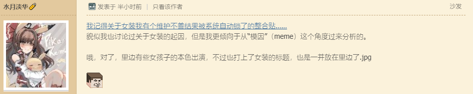 我记得关于女装我有个维护不善结果被系统自动锁了的整合贴……
