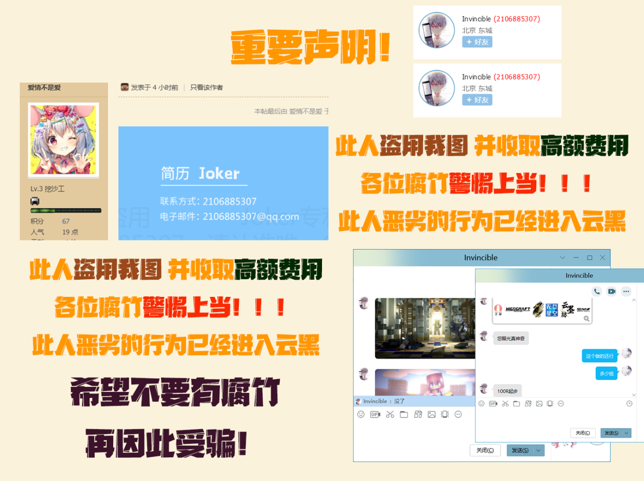 首先 我只是将你所做的事情以截图的形式发到了几个我常活跃的群里