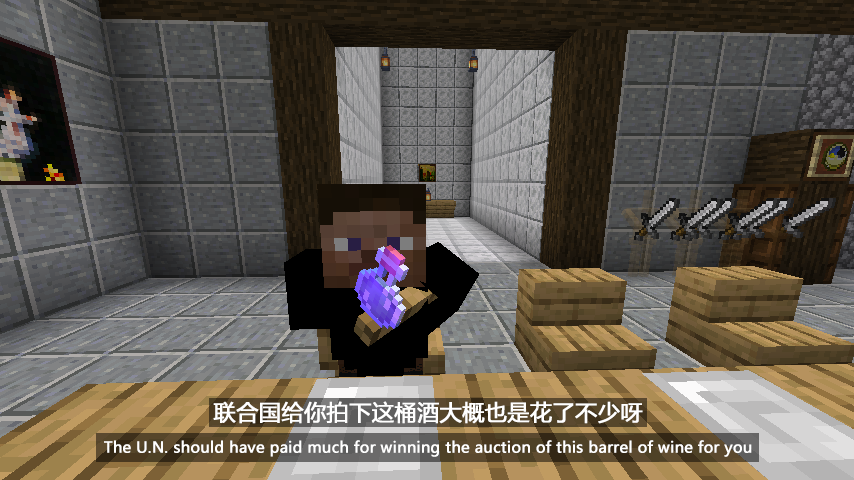 墙上的装饰、窗帘、墙边的武器架、立钟....