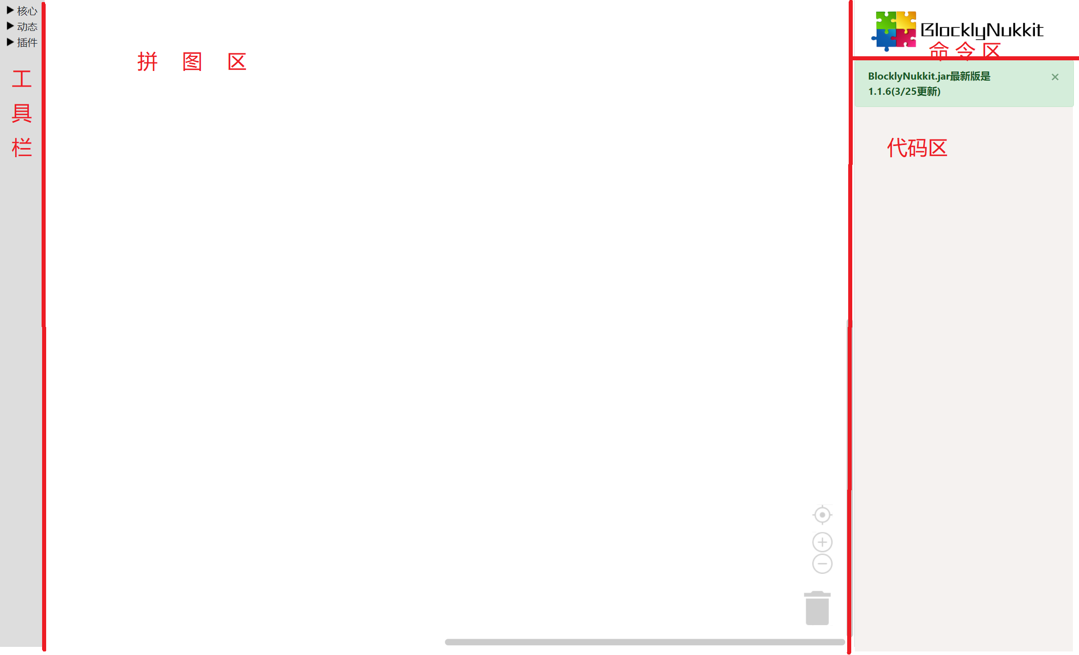 拼图区是将拼图块拼在一起用来构建插件的区域,右下角有四个按钮,从上到下是一个准星,+,—和垃圾桶,他们分别可以将拼图块整理,进行缩放和清除拼图。