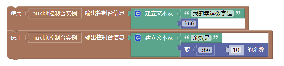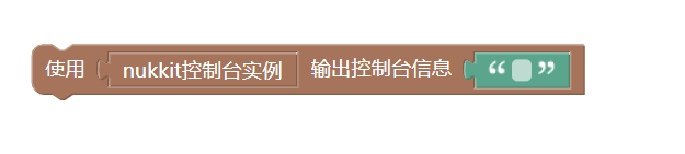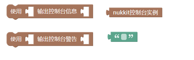 右侧两个块是两个输出块(指左侧有突起可以插入到其他块里面的拼图块),右上角的块输出(这里的输出是指向其他块输出值(值是一对一些数据的叫法))的是nukkit控制台实例。右下角的块是字符串块,字符串是文本的别称,你可以点击中间的浅色区域来编辑内容(手机部分浏览器弹出键盘后会瞬间收起来,请加群下载手机客户端解决或者换一个浏览器解决),它输出你编辑的字符串。